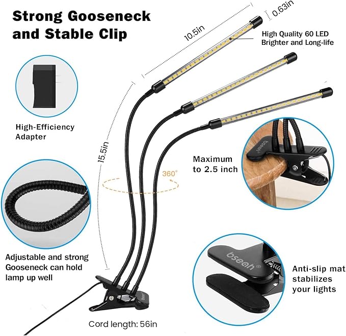 bseah Grow Light Plant Lights for Indoor Plants, Full Spectrum Led Growing Lamp with 3/9/12H Timer, Auto ON & Off, 10 Dimmable Lightness Clip-On Desk