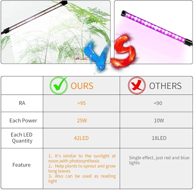 • 【Sunlight White + Red LEDs】Eqquiped with 5 Red+37 Sunlight White LEDs in each bar,which is similar to the sunlight at noon,and ideal for all sorts of indoor plants at all growth stages.Also,GHodec 6000K LED lights provides exceptional color-rendering up to 95 ,it is flicker-free and soft light, great for you to reading at night.