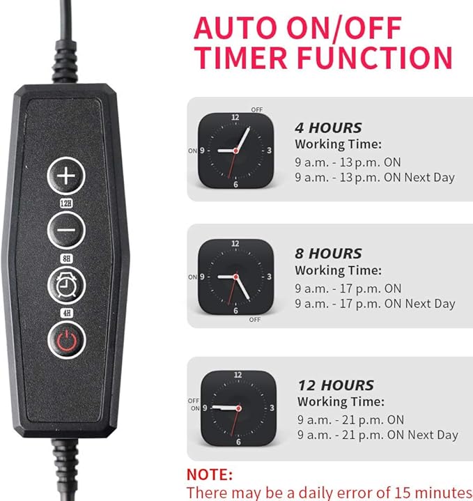 • 【Timing Function & Versatile Settings】 Indoor plant lights offer 3 timing options-4H/8H/12H lighting time everyday. Auto on/off and no more manually operation everyday.Each LED bar can control its on/off separately. You can press the switch button multiple times -- one light ON, two lights ON, three lights ON,or all are off.You can also adjust the brightness of the led grow lamp according to your plants needs.