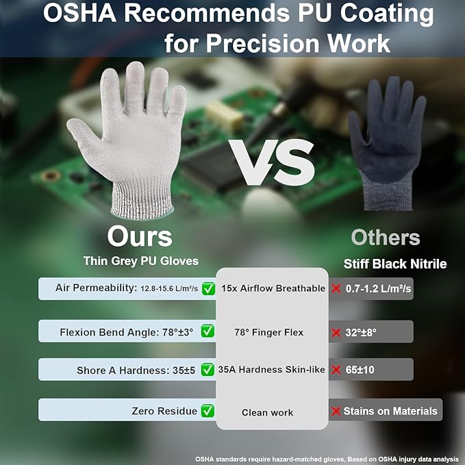 • [DEXTERITY AND COMFORT] The ultra-thin coated PU layer, 13-gauge HDPE cut resistant fabric, spandex & high elastic nylon blended make the working gloves fit your hands appropriately. They are excellently qualified for jobs requiring dexterity and will give you more confidence in your work, such as construction, gardening, warehouse, mechanic, yard work, weeding, garbage collecting…