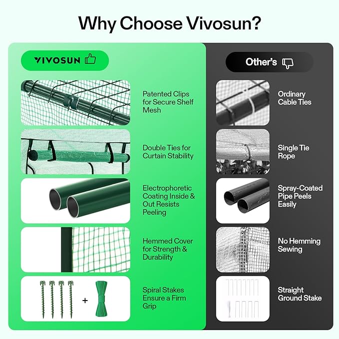 • Sturdy & Durable Framework: Supported by a powder-coated heavy-duty steel frame, the walk-in green house is very sturdy and firm; An additional 4 ropes and stakes can help you strengthen its stability and safety