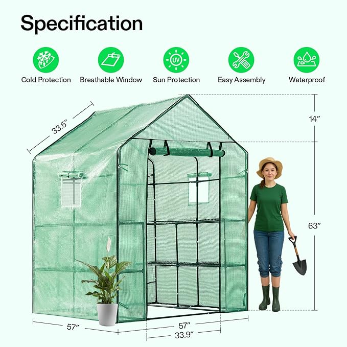 • Multi-shelves, Large Space: Crafted with 8 wired shelves; Overall Dimensions: 57 x 57 x 77-inches; Our green house is large enough for starting seedlings, sprouting young plants, blooming flowers, and cultivating fresh vegetables