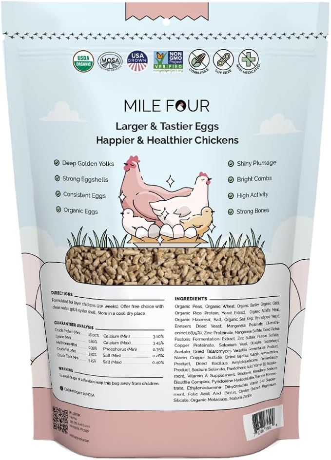 • HEALTHIER & HAPPIER CHICKENS: Shiney plumage, bright colored combs, strong, confident chickens with high activity level. Quality organic chicken feed formulated with 16% protein, essential vitamins & minerals for optimal health, nutrition & egg production