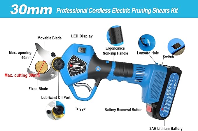 • 【Very Sharp & Strong Power】 -- The KOMOK electric pruning shears’ blade is forged from SK5 high carbon steel and powered by brushless motor. The brushless motor provides more power to cut 1.2" branches easily. The high-quality SK5 blades are durable and sharp, offering optimal cutting performance for healthy plant regrowth.