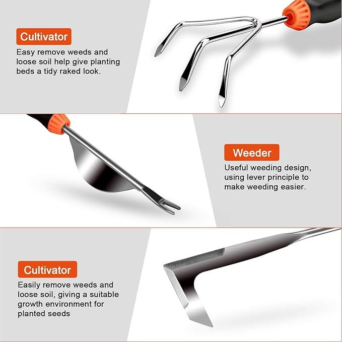 • 【Versatile Garden Accessories】 For all your household planting needs, these eight types of hand tools are extremely helpful. This stainless steel garden tool includes every detail you require, from weeding and digging up to aerating the ground and transplanting. Bringing your gardening dreams to life with the help of your natural thumb.