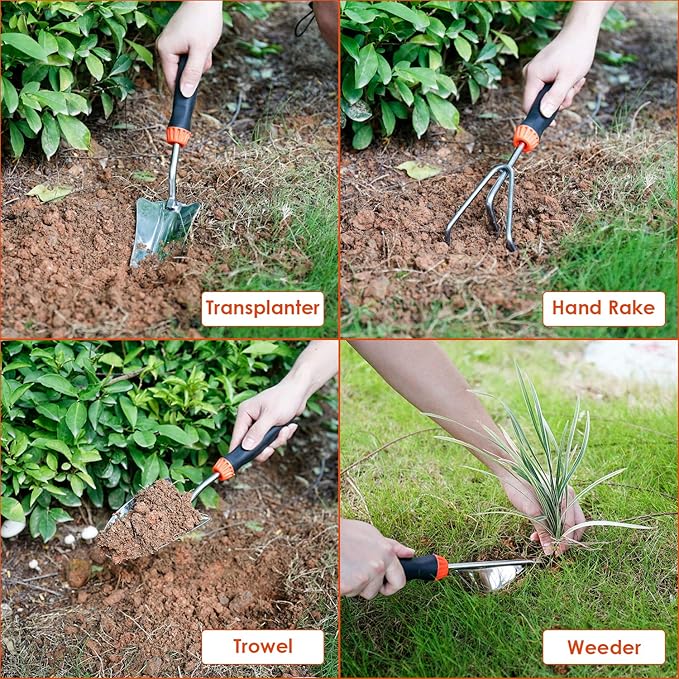 • 【Complete Garden Tools】Our gardening tool set presents everything that you need for planning the backyard paradise of your dreams, including 9 essential items. A trowel, transplant, hand rake, cultivator, weeder, pruner, and handy tote container are all included in this package.