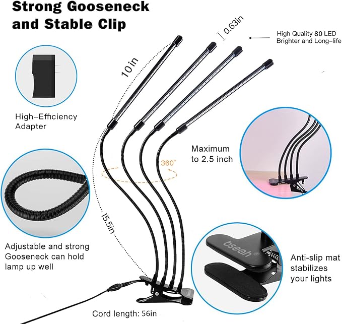 • Larger Illumination Area: 120° beam angle 4 head clip on grow light, equipped with flexible gooseneck and rotatable bulbs.