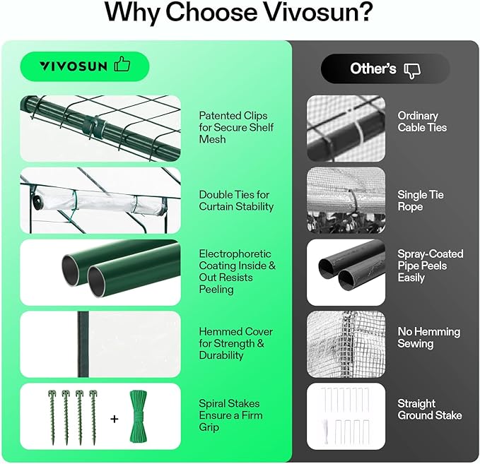 • Easy Installation & Storage: All accessories are included: with step-by-step instructions, an adult can easily set up our Vivosun greenhouse without any other tools necessary; As the seasons change, it can easily be deconstructed either for storage or transportation
