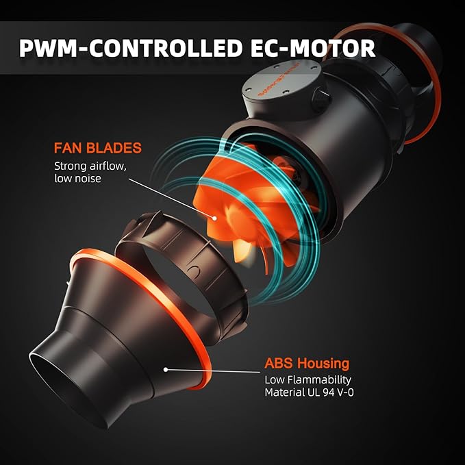 • Powerful Ventilation System: Quiet and low noise (26.8 dB) 4” Inline fan 205 CFM airflow with RC412 activated carbon filter and flexible duct. Provides excellent air circulation and eliminates odors. Clip fan delivers airflow ranging from 0 to 2500 RPM, flexible rotation quick circulation cooling, and customizable 10 speeds for all plant growth stages.