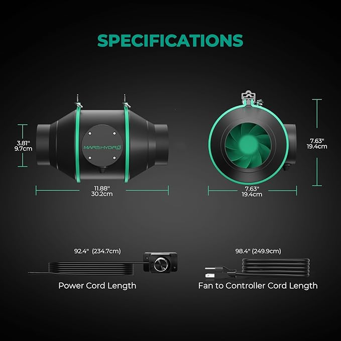 • 【ADJUSTABLE&EFFICIENT VENTILATION SYSTEM】Fan Speed 2550RPM , Airflow: 205 CFM , Noise: 26.8dB. Upgraded Inline Fan with EC motor & metal case &0 to100% speed controller, more durable & safer to use! 4" Fan Carbon Filter; 1050+RC 48 Australian virgin charcoal, equipped with 25 ft long flexible pipes, quickly and effectively transports air, effectively filters impurities and odors in the air.