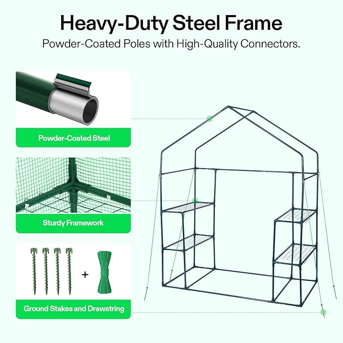 • Sturdy & Durable Framework: Supported by a powder-coated heavy-duty steel frame, our walk-in green house is very sturdy and strong.4 included tie-down ropes and stakes protect our hot house from being blown down by the wind, increasing its stability and safety