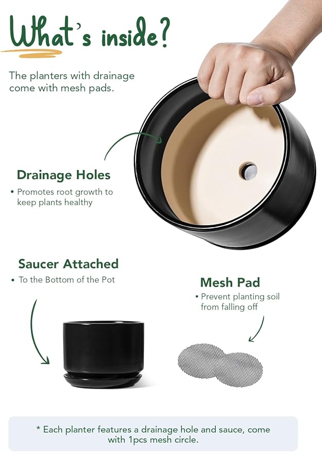• Pots With Drainage Hole & Drip Pans & Drainage Net: The hold in the bottom allows the excess water to exit out of the soil when you’re watering the plant; The drainage plates are attached to the bottom of the pots and do not come off; Drainage Net is included, which is designed to prevent planting soil from falling off (Plant is not Included)