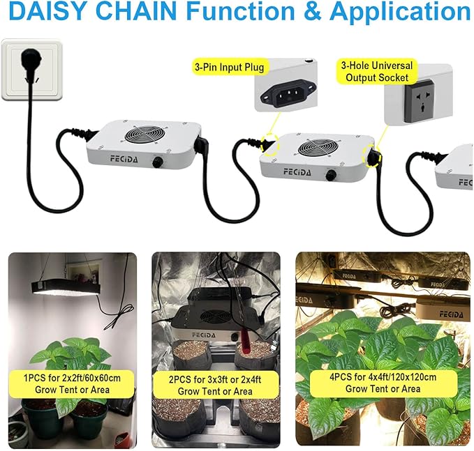 • 【Daisy Chain Function & Easy To Use】The power cable in the package is also just the daisy chain cable. You can use one power cable to connect the grow light to your home electricity and use other power cable to connect the grow lights together if you have more than two grow lights. You can connect max 4pcs 130 Watt plant grow light together.