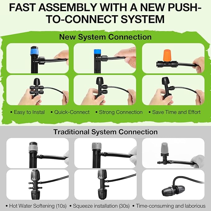 • Automatic irrigation kit is great for atomization, lawn irrigation, patios, roof cooling, agriculture, vegetable, greenhouse, flower bed, swimming pool misting fog cooling irrigation etc.