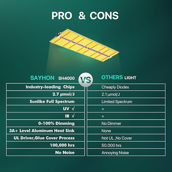 • ๐ŸŒฟ Ideal Cooling System: Full coverage 3A+ level aluminum heat sink can lower temperatures 50ยฐF greater than other brands, Sayhon led grow light maintain brightness at 95%+ after 3 years of use.