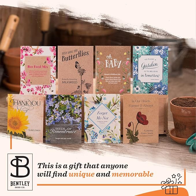 GROW GOOD THINGS: At Bentley Seeds, we pride ourselves on providing consistent and high-quality flower seeds. Bentley Seed Co. offers multiple packet sizes, paper choices, and many seed varieties to accommodate any event. All of our favor packets comply with USDA and all 50 States Dept. of Agriculture guidelines. Packet size: 3 ¼" x 4 ½".