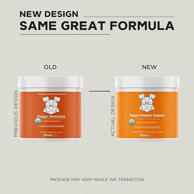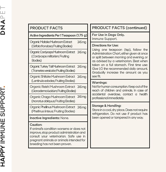 • USDA Organic Mushroom Powder Mix: Happy Immunity is a certified organic mushroom complex dog supplement with a selection of seven mushroom fruiting bodies extracts delivered all in one in a powder form. With its organic certification under USDA organic standards, DNA PET USDA organic mushroom powder mix offers a unique guarantee for quality for your pet.