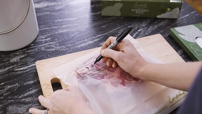 • OCCASIONS: ENA's unbleached and dye-free resealable bags are made from plant starch in off-white color. They are packaged in recyclable boxes for easier storage and usage. ENA's food bags keep food fresh and nutritious. They are perfect for meat, fish, and chicken storages and marinade in the refrigerator. They are perfect for storing food like sandwiches, bite-size snacks, fruits, cookies, pie and quick bites.