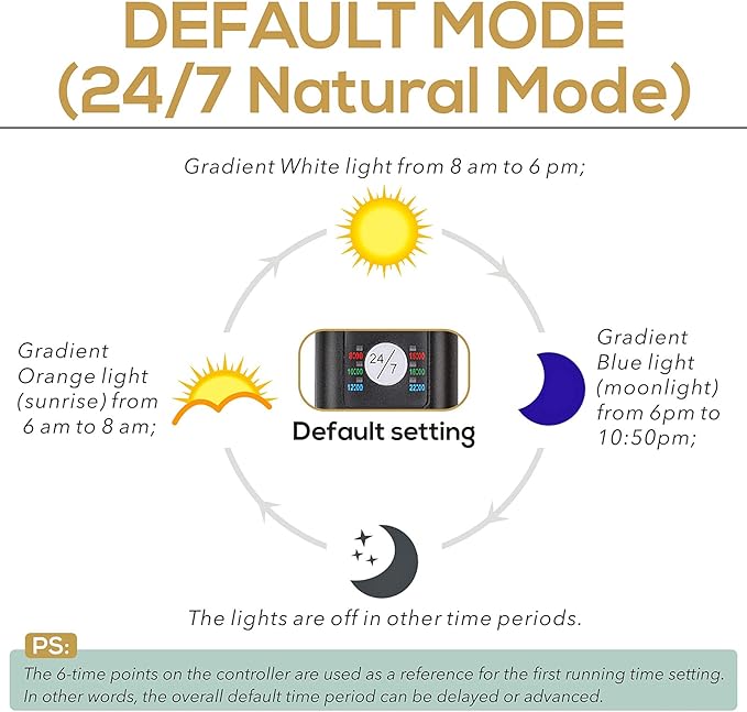 • DEFAULT MODE(24/7 Natural Mode): Gradient Orange light (sunrise) from 6 am to 8 am; Gradient White light from 8 am to 6 pm; Gradient Blue light (moonlight) from 6 pm to 10:50 pm; The lights are off in other time periods. PS: The 6-time points on the controller are used as a reference for the first running time setting. In other words, the overall default time period can be delayed or advanced