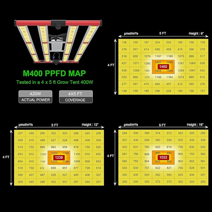 • High PPFD Grow Light for Better Yields - This 420W grow light uses 1360 SMD LEDs, delivering up to 1238 μmol/㎡/s PPFD across a 4x5 ft area. It provides strong, uniform lighting that supports healthy plant growth and higher yields, with efficiency up to 2.5 g per watt under optimal conditions.