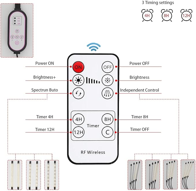 • ☼Intelligent Energy Saving: the plant lamp has dual control and multi-function - wire in controller and RF controller (which can protect your eyes from looking directly at the lamp). It supports 3 kinds of lighting modes, 10 kinds of dimmable levels, 4 kinds of lighting independent control, and automatically turns on / off every day after setting 4H / 8h / 12h timer. Each function is compatible. Equivalent to 100W HPS lamp.