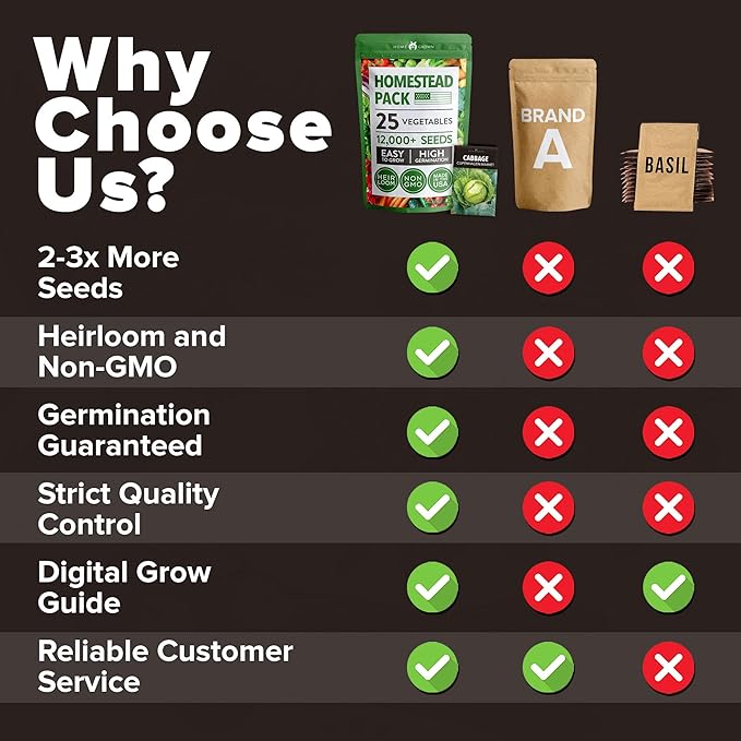• YEAR-ROUND HARVESTS: Balanced selection of warm and cool season vegetable seeds variety pack for continuous growing; Plant in spring, summer, and fall for extended harvests; Carefully selected heirloom seeds survival kit with exceptional germination rates