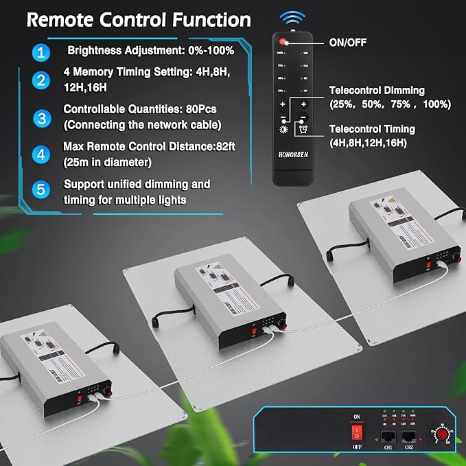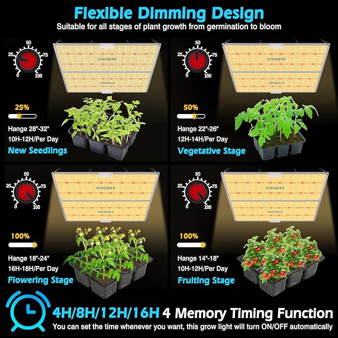 • 【Dimmable and Timing Function】The intensity of light can be adjusted from 0% to 100% according to the needs of plants. This grow lamp can be timed to 4,8,12,16 hours with memory function, which can automatically turn on and off everyday without manual operation, very convenient. The remote control design supports unified dimming and timing for multiple lights, especially beneficial for large-scale indoor planting and commercial planting.