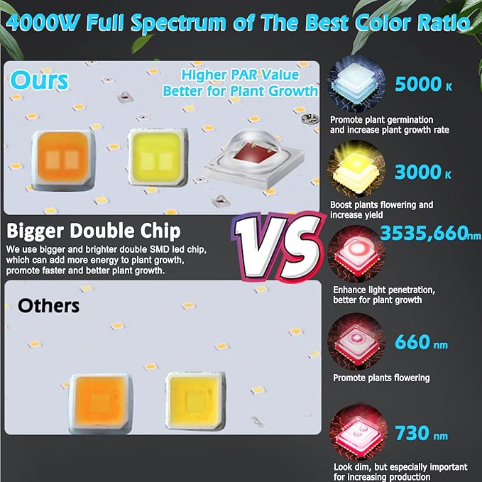 • 【Optimal Full Spectrum Grow Light】The leds are all new technology SMD leds. The growing lamp contains 3000K, 5000K, 3535-660nm, 660nm and 730nm, ideal for indoor plant from veg to flower growing. Uniform canopy penetration to maximize higher yields and crop quality, much better than traditional HPS grow systems.