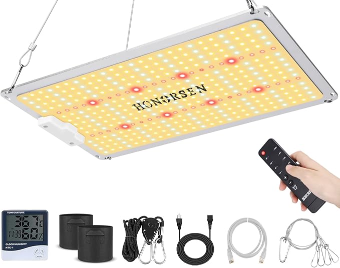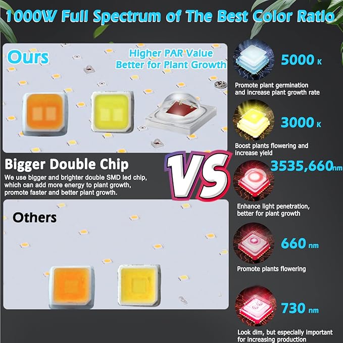 • 【Optimal Full Spectrum Grow Light】The leds are all new technology SMD leds. The growing lamp contains 3000K, 5000K, 3535-660nm, 660nm and 730nm, ideal for indoor plant from veg to flower growing. Uniform canopy penetration to maximize higher yields and crop quality, much better than traditional HPS grow systems.