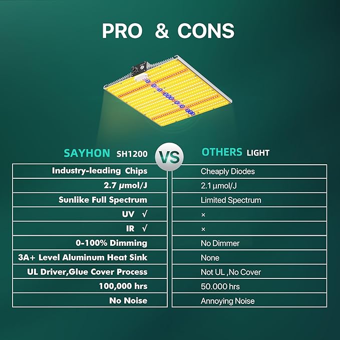• ๐ŸŒฟ Ideal Cooling System: Full coverage 3A+ level aluminum heat sink can lower temperatures 50ยฐF greater than other brands, Sayhon led grow light maintain brightness at 95%+ after 3 years of use.