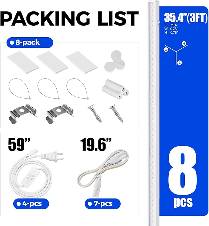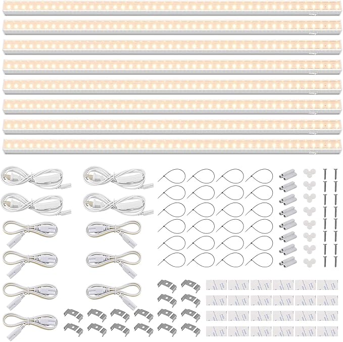 • What You Get - 8 x Barrina T5 Grow Lights, 4 x Power Cords with ON/OFF Switch, 7 x Connecting Cords(20''), 8 x Small Connectors, 16 x Installation Clips, 24 x Double-sided Tapes, 24 x Cable Ties
