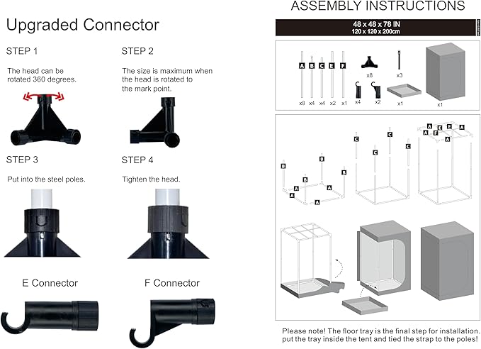 • Upgrade Design --- UPGRADED CONNECTOR--Durable PA Material Adopted, Anti-rust Reinforced Design, Adjustable Tightness According to The Pole, Hold Poles Tightly for Firmed Support. Multiple vents to accommodate fans and filter; ducting rectangle window with mesh to keep dust and insects out; Removable mylar floor tray easy to clean.