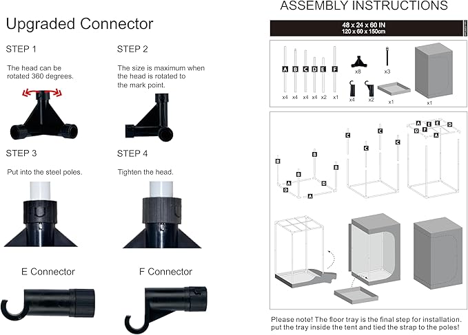 • Upgrade Design --- UPGRADED CONNECTOR--Durable PA Material Adopted, Anti-rust Reinforced Design, Adjustable Tightness According to The Pole, Hold Poles Tightly for Firmed Support. Multiple vents to accommodate fans and filter; ducting rectangle window with mesh to keep dust and insects out; Removable mylar floor tray easy to clean.