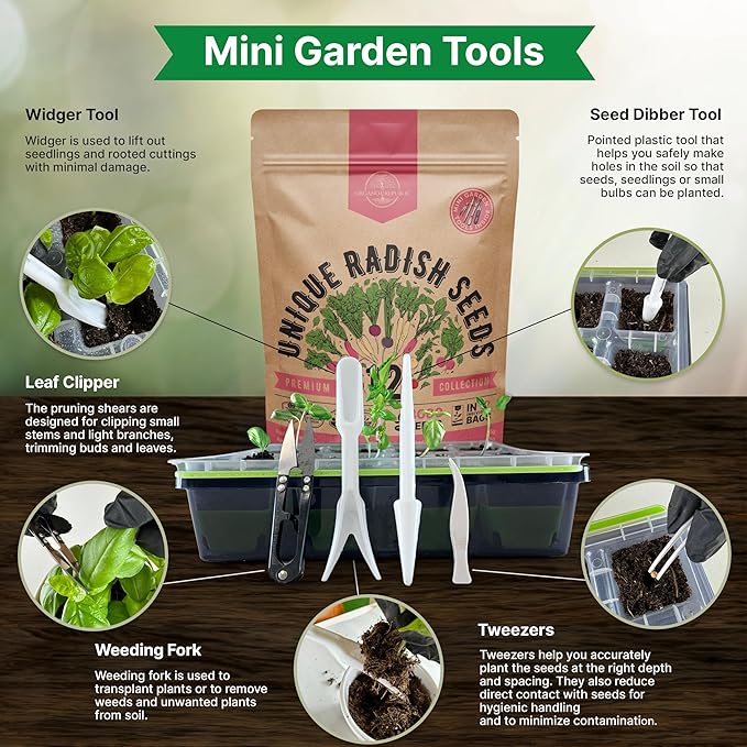 • 🏑 Fresh Radish from Seeds to Your Table All Year Round. Grow radishes from seeds everywhere - Indoor in aerogarden, window, and hydroponics garden or transfer them to your Outdoor Home Garden. Our radish seeds for planting are also suitable for Microgreens and Sproutings. Grow your seeds and enjoy healthy meals with the help of our cooking guide.