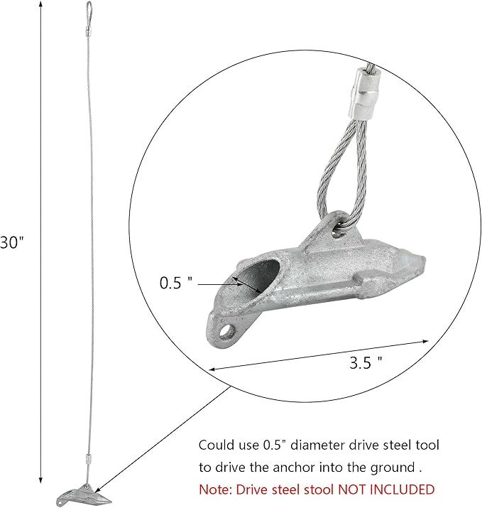 • 【Easy to Use】You will need a hammer and a 0.5inch diameter drive steel tool to drive the anchor into the ground with no holes, no concrete, and no digging required. Remove the drive tool and pull up on the cable to set the toggle. The upward pull rotates the earth anchor into a perpendicular lock position allowing it to firmly secure your item to the ground. Note: drive steel tool is not included.