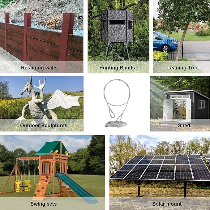 • 【Heavy Duty Material】Earth Anchor works like a toggle bolt in the soil to secure many items to the ground that are prone to theft or being moved. Constructed with stainless steel cable and galvanized carbon steel anchor for maximum life and stability. It is rust resistant and suitable for all soils.