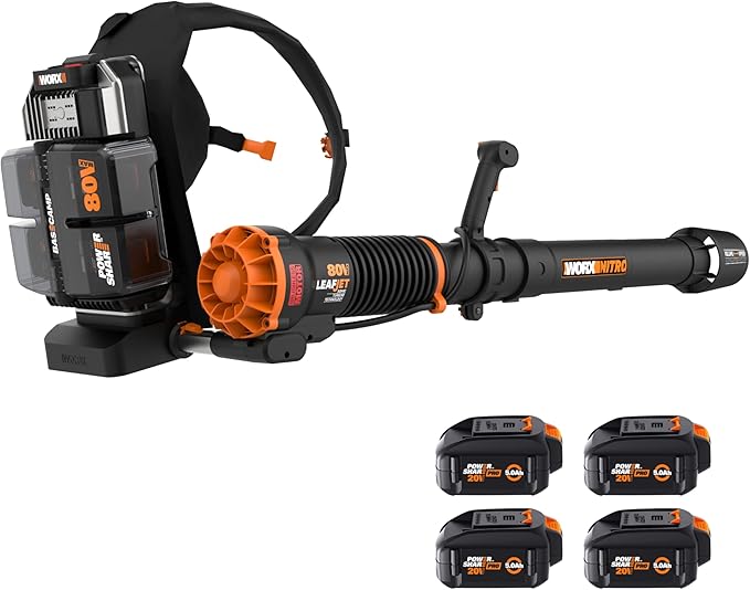 WORX Nitro WG572 80V Cordless Leaf Blower, Backpack Blower with 800CFM & 150MPH, Electric Blower for Lawn Care with Brushless Motor & Variable Air Control, 4 Batteries & Basecamp Charger Included