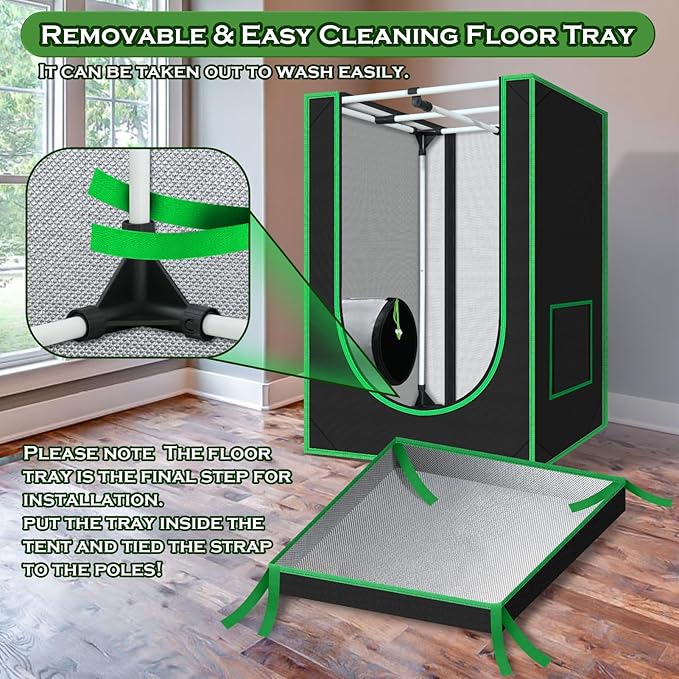• HIGHLY REFLECTIVE --- The grow tent includes a removable Mylar floor tray, and a 100% light-proof, tear-proof reflective Mylar lining to assist your indoor growing light fixtures and equipment. Increase the intensity of your grow lights and retain heat to keep your grow room at the right temperature for your plants, herbs, flowers, fruits, and vegetables to thrive
