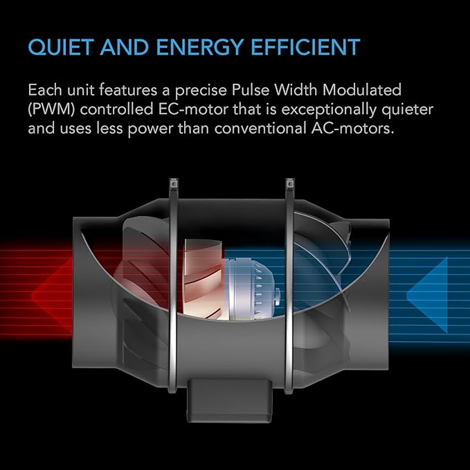 • 6-inch inline fan with PWM-controlled EC motor for quiet and energy-efficient ventilation, rated at 402 CFM airflow and 32 dBa noise.