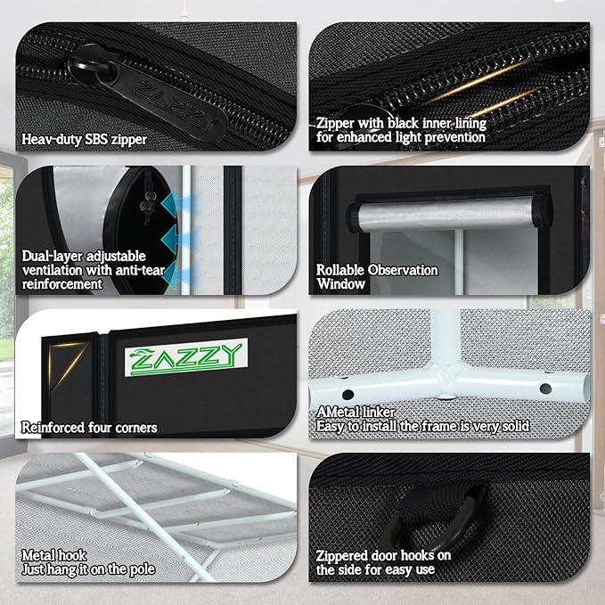 • Top-Quality Materials and Sturdy Frame---Zazzy plant grow tent made of superior quality reflective 600D mylar and double stitched to ensures the light blocking. Heavy duty all steel poles which are rated to handle at least 110 lbs. The frame is specially finished to ensure smooth installation and safe handling.