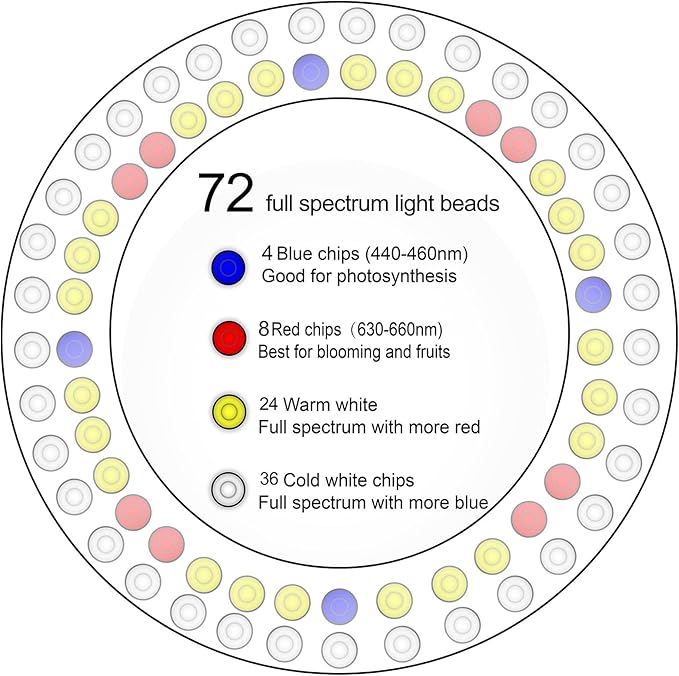 • Designed For Large Plant LED Grow Light Full Spectrum - Compact grow light with high quality super bright LEDs, offer full spectrum 380nm-800nm, including white5000K/18 LEDS,warm white 3000K/18 LEDS,red/8 LEDS,blue/4 LEDS to effectively promote indoor plant growth any time of year, beneficial to entire growth period.