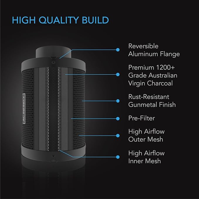 • Australian carbon filter with flexible ducting traps odors while routing stale air away from your grow tent.