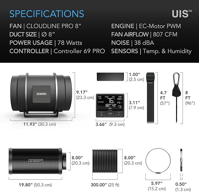 AC Infinity Air Filtration PRO Kit 8”, Inline Fan, Temperature Humidity VPD Controller with WiFi App Control, Carbon Filter, Ducting, Ventilation System for Grow Tents, Hydroponics, Indoor Gardening