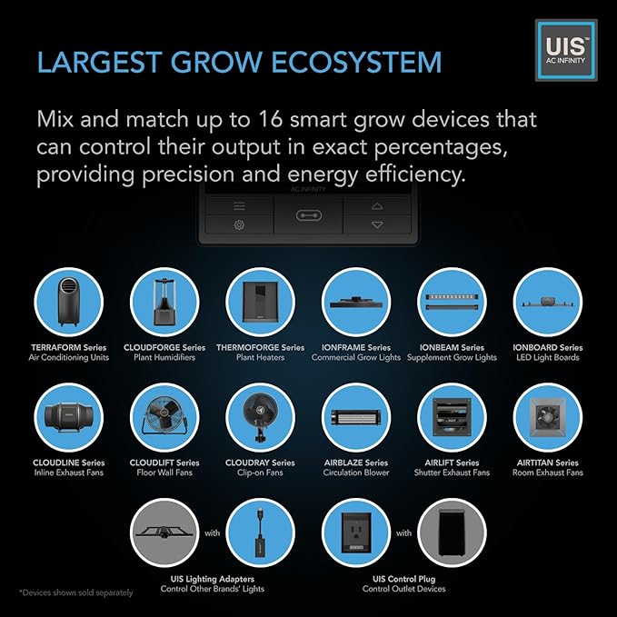 • Smart controller sets triggers, schedules, and grow cycles. Remotely access via WiFi app to enable automation.