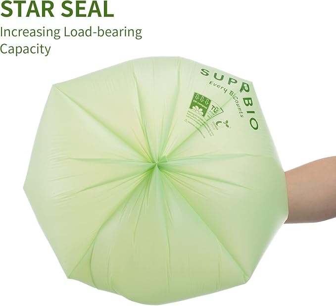 • Product Feature: SUPERBIO bags are guaranteed to remain strong, sturdy and tear proof when used in accordance with the recommended usage directions. Patented processing technologies. Handle tie and star sealed reinforced bottom to securely hold even the heavy load