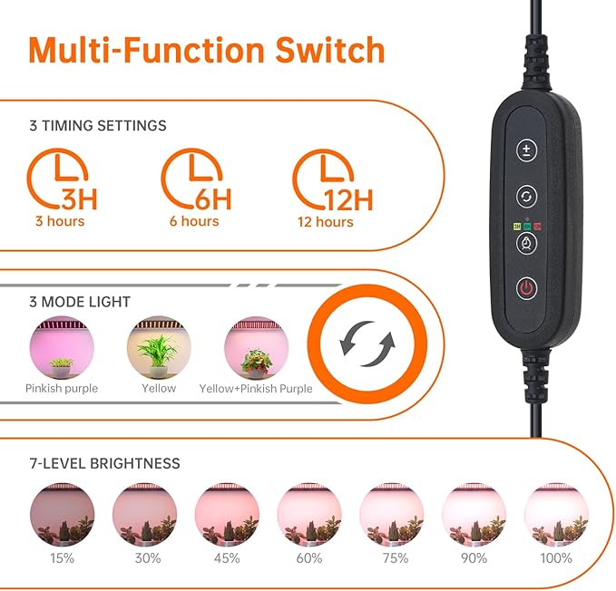 • Multi-function Switch - The switch offers three light modes: yellow, pink, and mixed light, allowing for customizable lighting conditions. It also provides three timing modes: 3/ 6/12 hours, facilitating automated lighting schedules. Additionally, the switch offers seven-level dimming, enabling the brightness to be adjusted from 15% to 100%. This versatile switch ensures the provision of optimal growing light for plants throughout the year