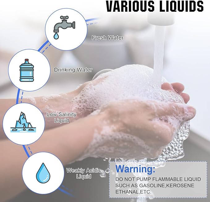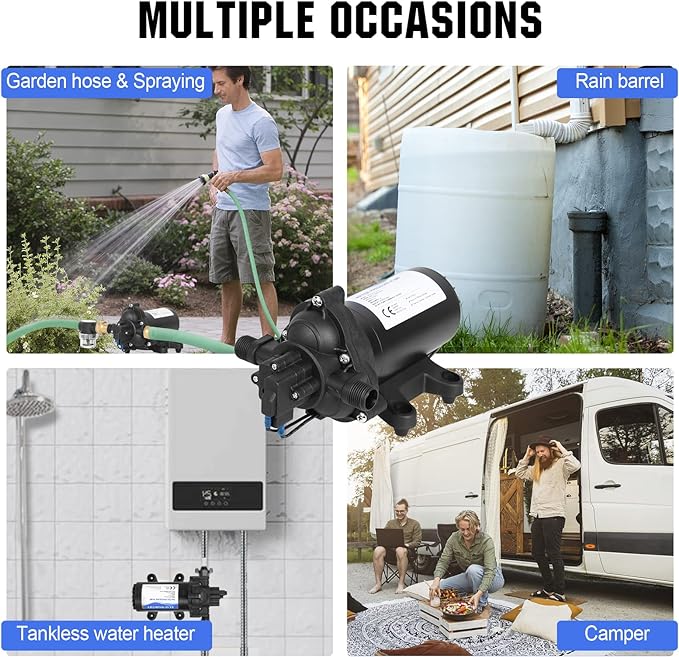 • Multipurpose: The nemesis of low water pressure. Support continuous operation for more than 1 hour. The water transfer pump is suitable for many fields, like RV, Marine, Boat, Irrigation, Sprinkler, Faucet and so on