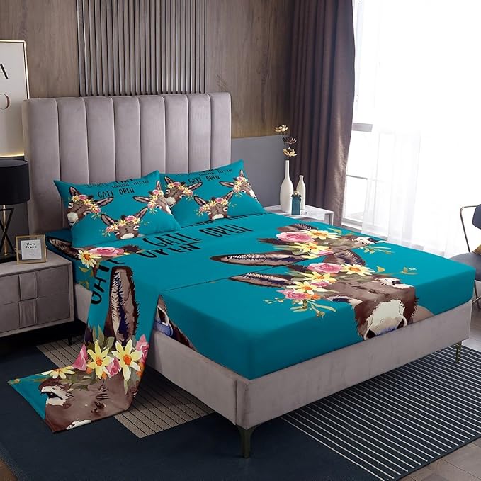 Donkey Sheet Set for Kids Boys Girls,Cartoon Funny Donkey Bed Sheets Queen,Farmhouse Animal Bedding Set,Rustic Botanical Rose Flower Leaves Fitted Sheet + Top Sheet + 2 Pillowcases Bedroom Decor
