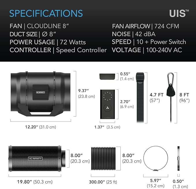 AC Infinity Air Filtration Kit 8”, CLOUDLINE LITE Inline Fan and Carbon Filter Combo, Cooling and Ventilation System for Grow Tents, Hydroponics, Indoor Gardening