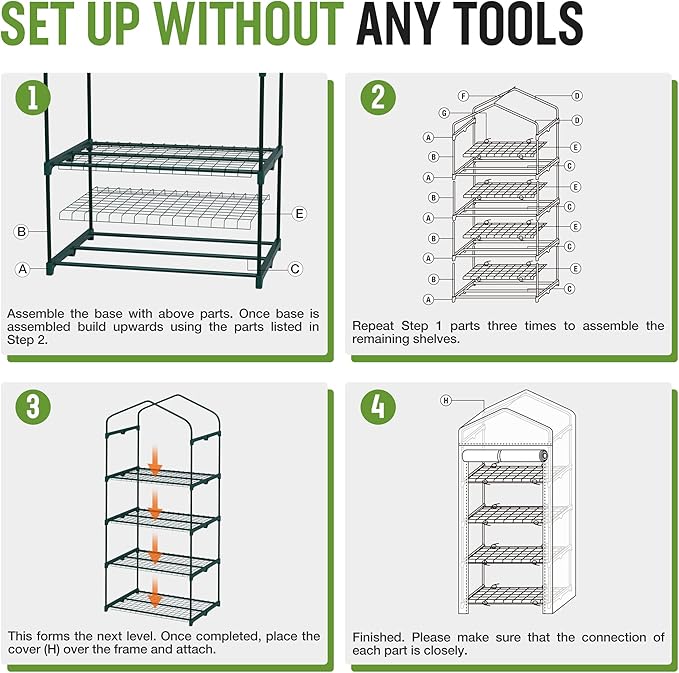 • Tool-Free Setup & Compact Storage: No tools required! This garden 4 tier greenhouse is designed for quick and easy assembly. Lightweight yet sturdy, it’s easy to move around and can be disassembled and folded for space-saving storage when not in use